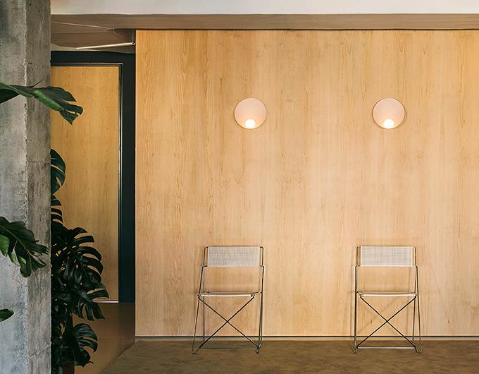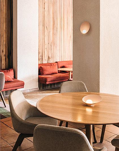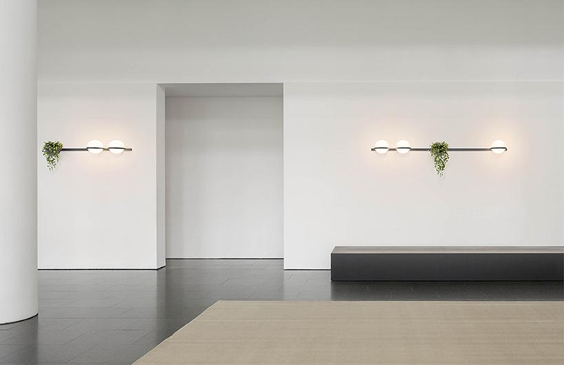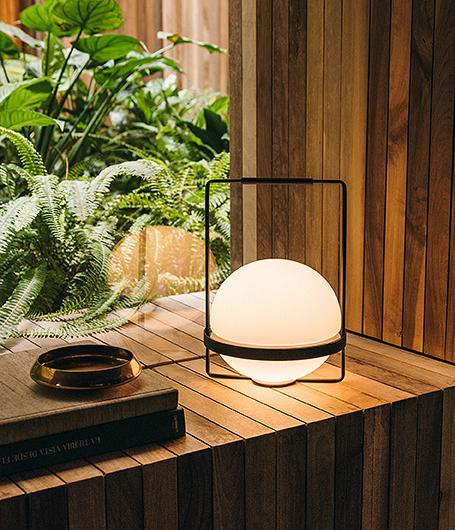 Continuamos con la colección Palma, caracterizada por una gran versatilidad al estar disponible en versión de pared, colgante y de sobremesa. Este sistema de luminarias, diseñado por Antoni Arola introduce en los interiores la vida vegetal asociada a la luz, propia del exterior. Sus múltiples composiciones en la versión de pared, vertical y horizontal, crean ejes visuales a gran escala, integrando la vegetación y el aplique de pared de gran formato, resulta idóneo para espacios colectivos. En la versión de suspensión, el clásico globo, levemente aplanado, cuenta con un sistema de cableado único imperceptible, que acentúa la sensación de flotabilidad. Por su parte, en las lámparas de sobremesa, las dos medias esferas de vidrio soplado opal tamizan la luz y se ensamblan mediante un aro y estructuras de aluminio, con acabado en tono grafito o blanco.